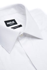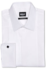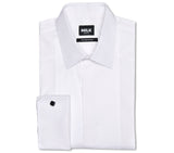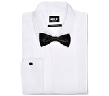 This is a modern take on the classic tuxedo shirt, crafted from luxurious 140’s poplin featuring a concealed placket, which is designed to provide a clean and sharp look. It is neatly finished with double cuffs a hand crafted spread collar, and a beautifully textured bib front. Keep things sharp with a sleek tuxedo and patent leather shoes. Add a patterned bow-tie for added flair.