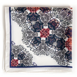 The colour combination makes it a classic, and its intricate detail enchanting. Experimenting with folds will allow for this pocket square to compliment all seasons.
